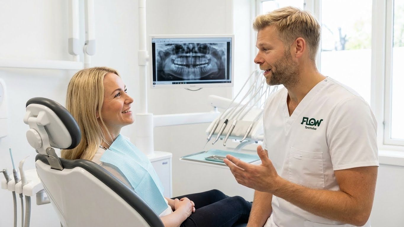 Bestill time hos Flow TannhelseMedisinsk ansvarsfraskrivelse: Informasjonen i denne artikkelen er ment som generell veiledning og erstatter ikke profesjonell tannlegekonsultasjon. Alle prisopplysninger er veiledende og kan variere basert på individuelle behov og behandlingsomfang. Kontakt Flow Tannhelse eller din tannlege for en personlig vurdering og nøyaktig pristilbud.